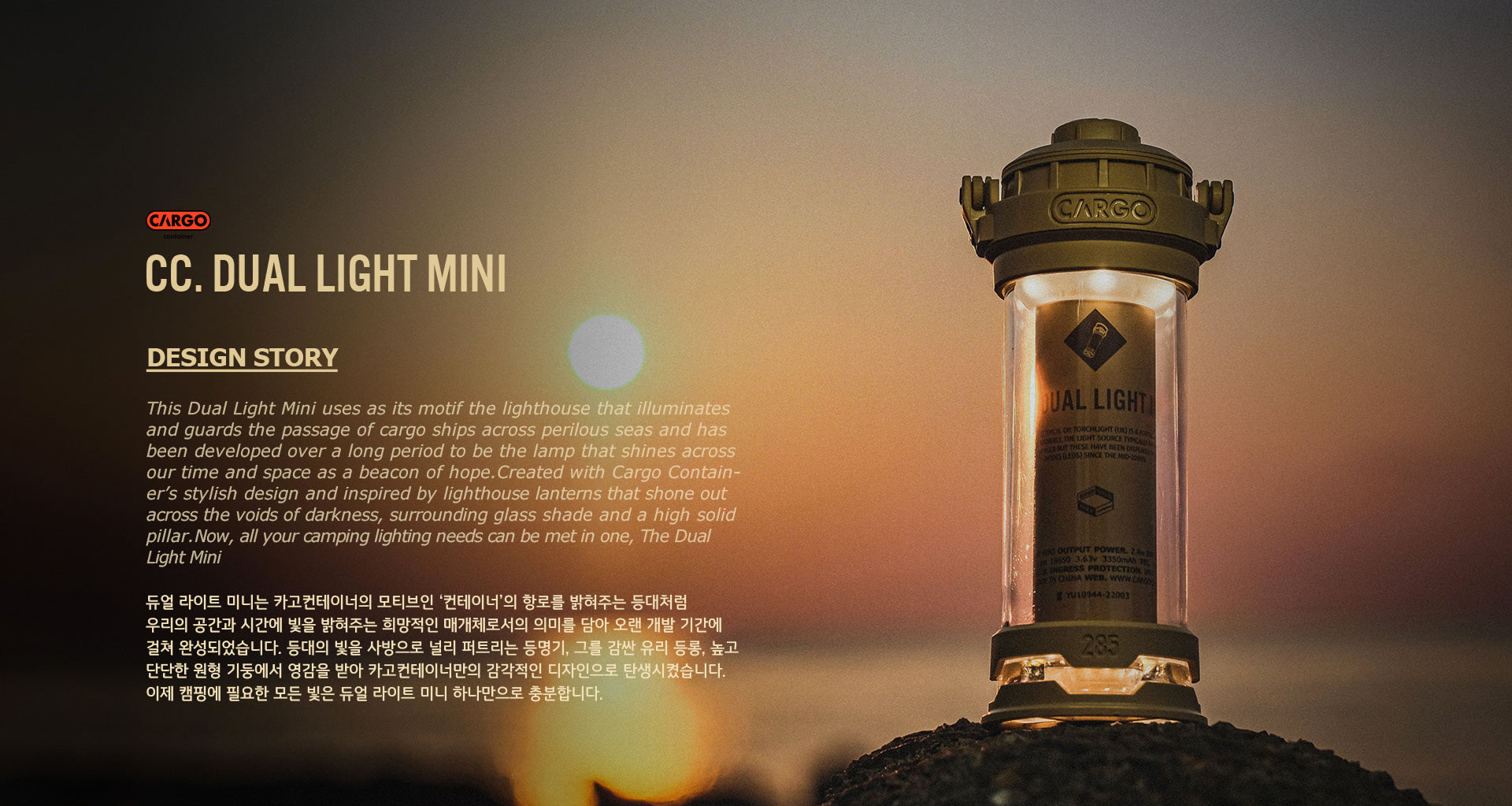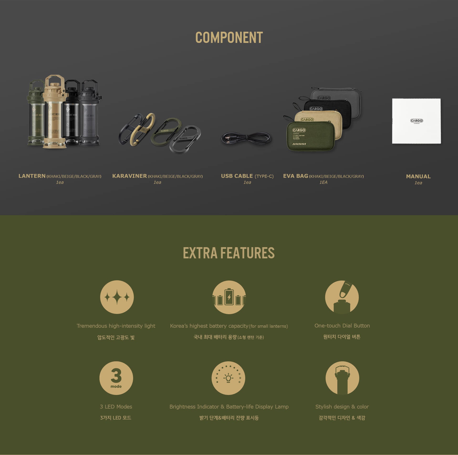 The Cargo Container Dual Light Mini realizes an overwhelming high-intensity light of 300Lm. It can be adjusted through its 3 LED modes of LOW - HIGH - LOW & HIGH. The one-touch dial button allows you to control: Power ON.OFF / LED Mode Change / Brightness, simply and conveniently. The Dual Light Mini is equipped with KC Certified 3350mAh LG battery so that you can use the lamp safety for long periods